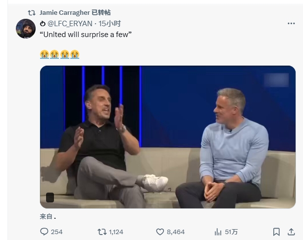 直播吧08月28日讯 曼联点球大战不敌英乙球队格林斯比赛后,卡拉格转发了老搭档内维尔的一段采访视频。